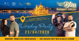 Read more2026 Apr 23 CsüSocial Bliss Thursday 100% Bachata Party21:00 DU - 01:00 DEBroadway Dance Center TáncstúdióBudapest, Kerepesi út 26., 1146, Magyarország4500 FtBudapestPartik / BulikWorkshopokBachataBővebben a jegyekről... -