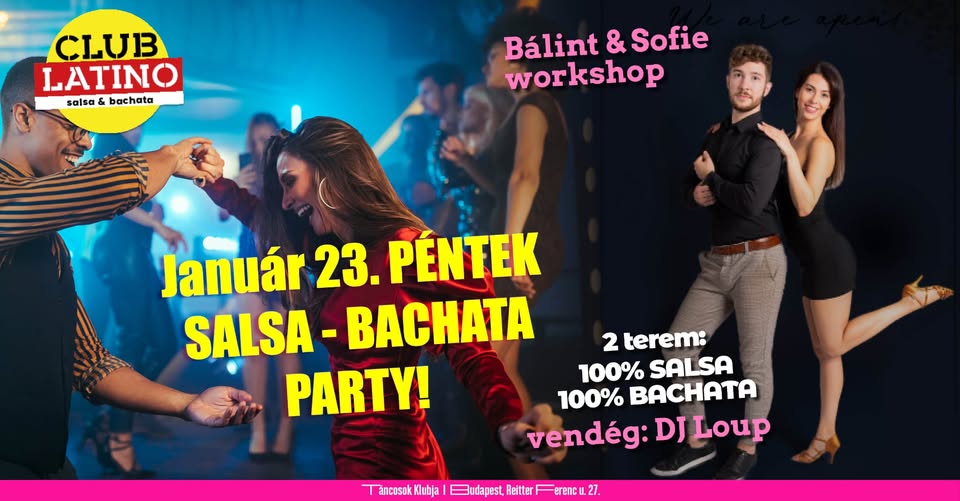 21 órakor bachata workshoppal kezdünk a kis teremben Bálinttal és Sofieval. Gyere bulizni, tanulj valami újat és utána táncold át az éjszakát!
